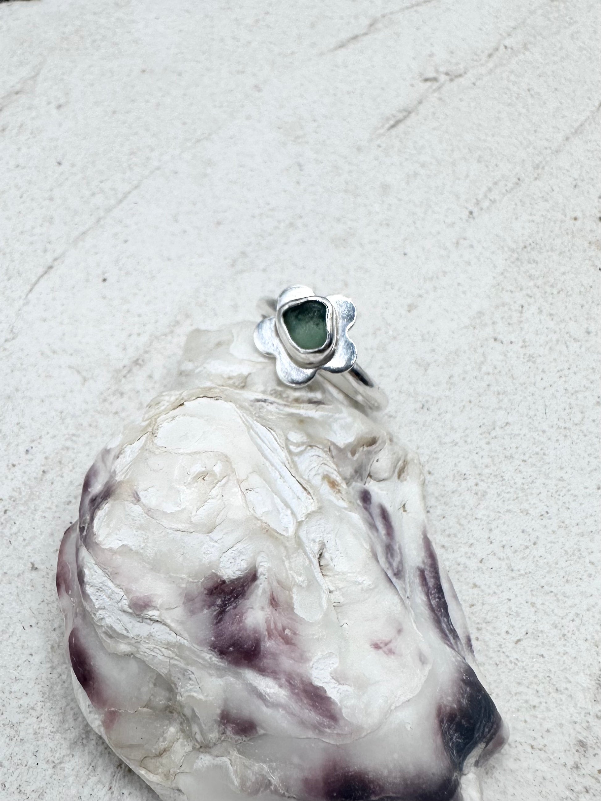 Green Seaglass Flower Ring Silver