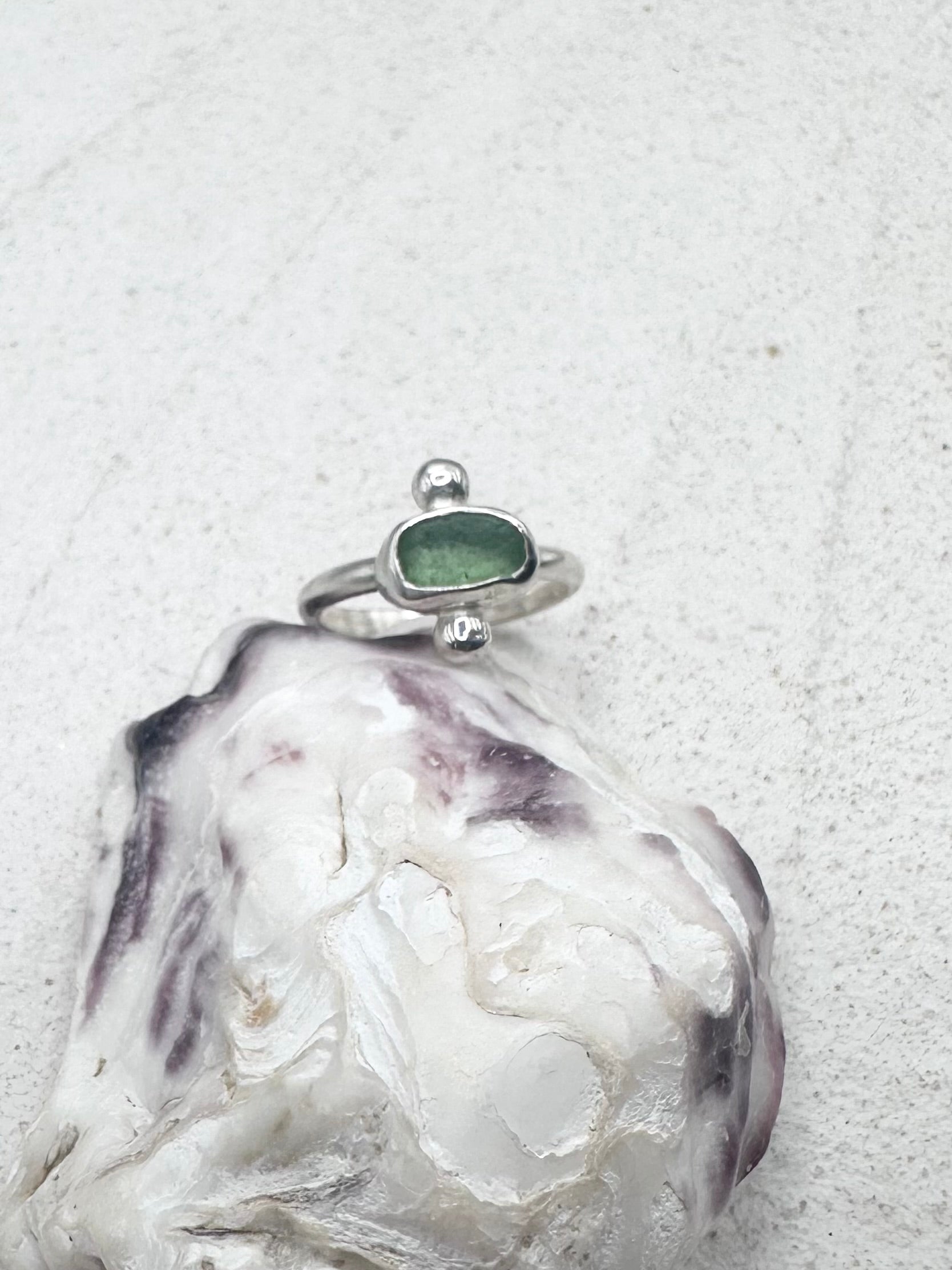 A handcrafted seaglass ring, made with recycled sterling silver and shaped by the sea. Each piece is one-of-a-kind, carrying its own ocean story. Beautifully versatile — Style it simply on its own or stack with other rings for a statement look.